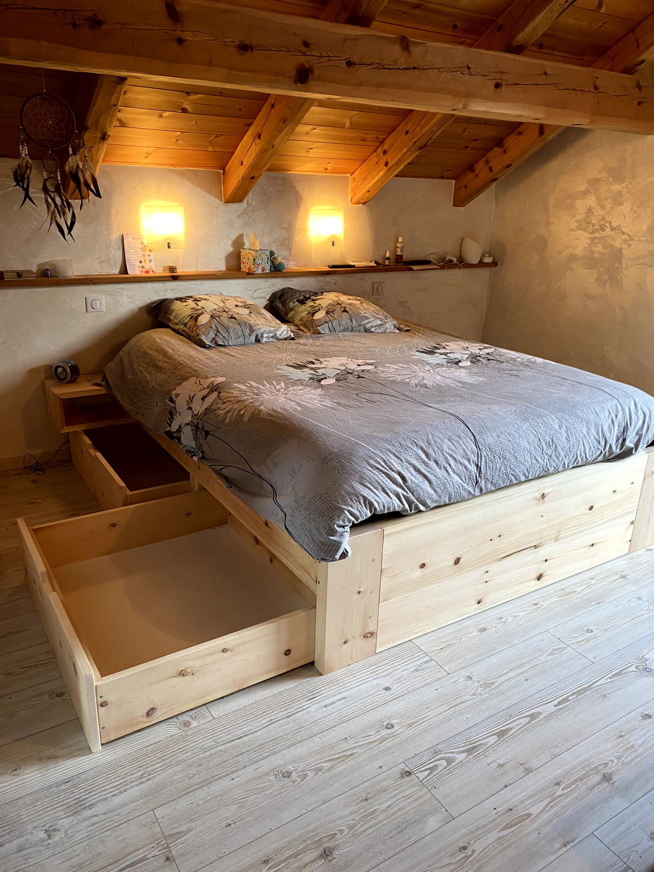 Réalisation d’un lit double avec rangements intégrés en bois de pays, sous pente de toit.