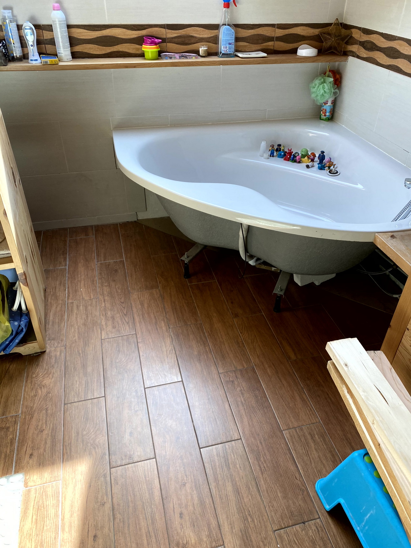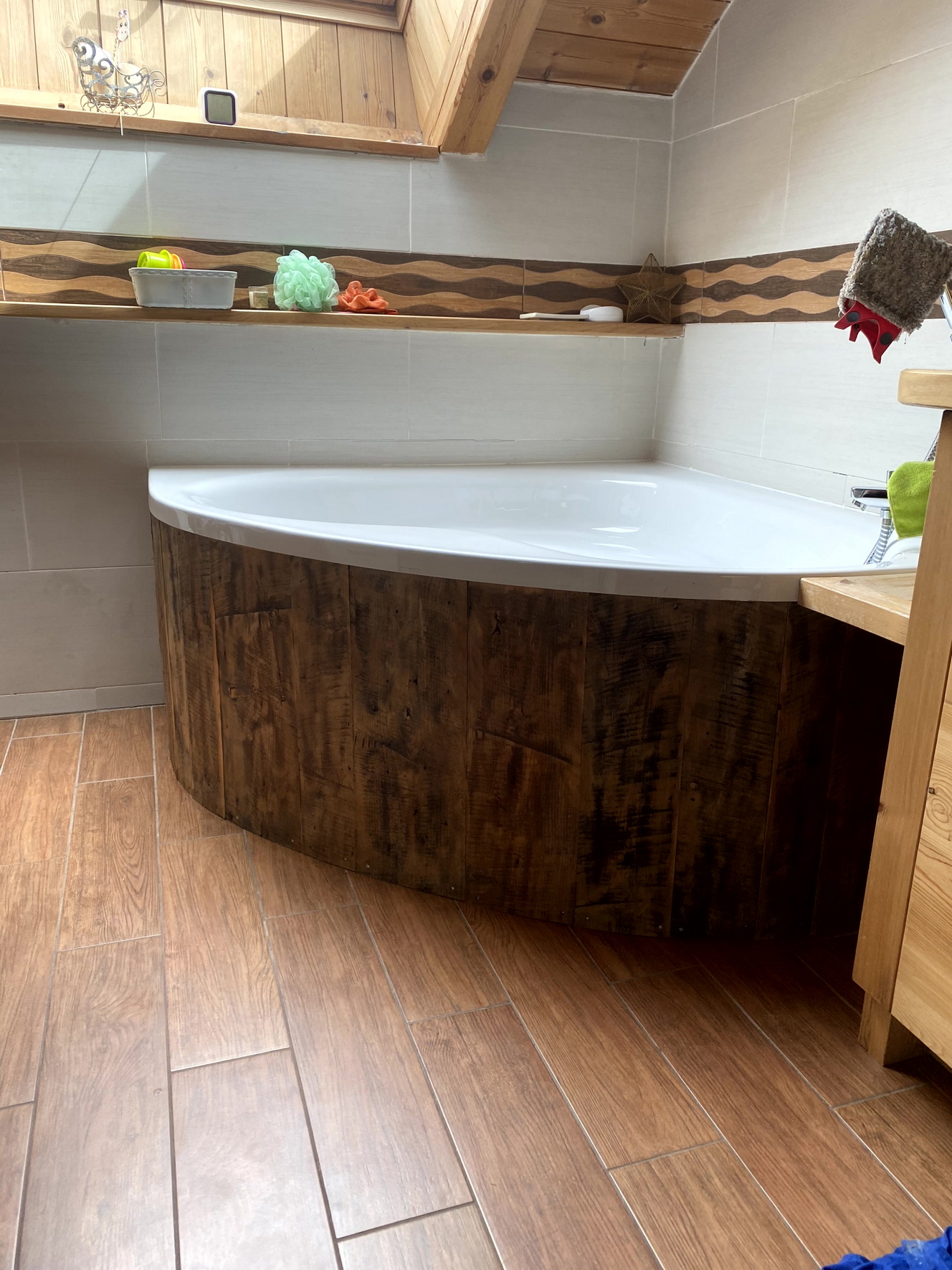 Aménagement d’une salle de bain sur mesure mêlant bois massif de pays et matériaux contemporains. Le tablier de baignoire, façonné en lambris brûlé et verni, apporte une chaleur naturelle et un style authentique à l’ensemble.