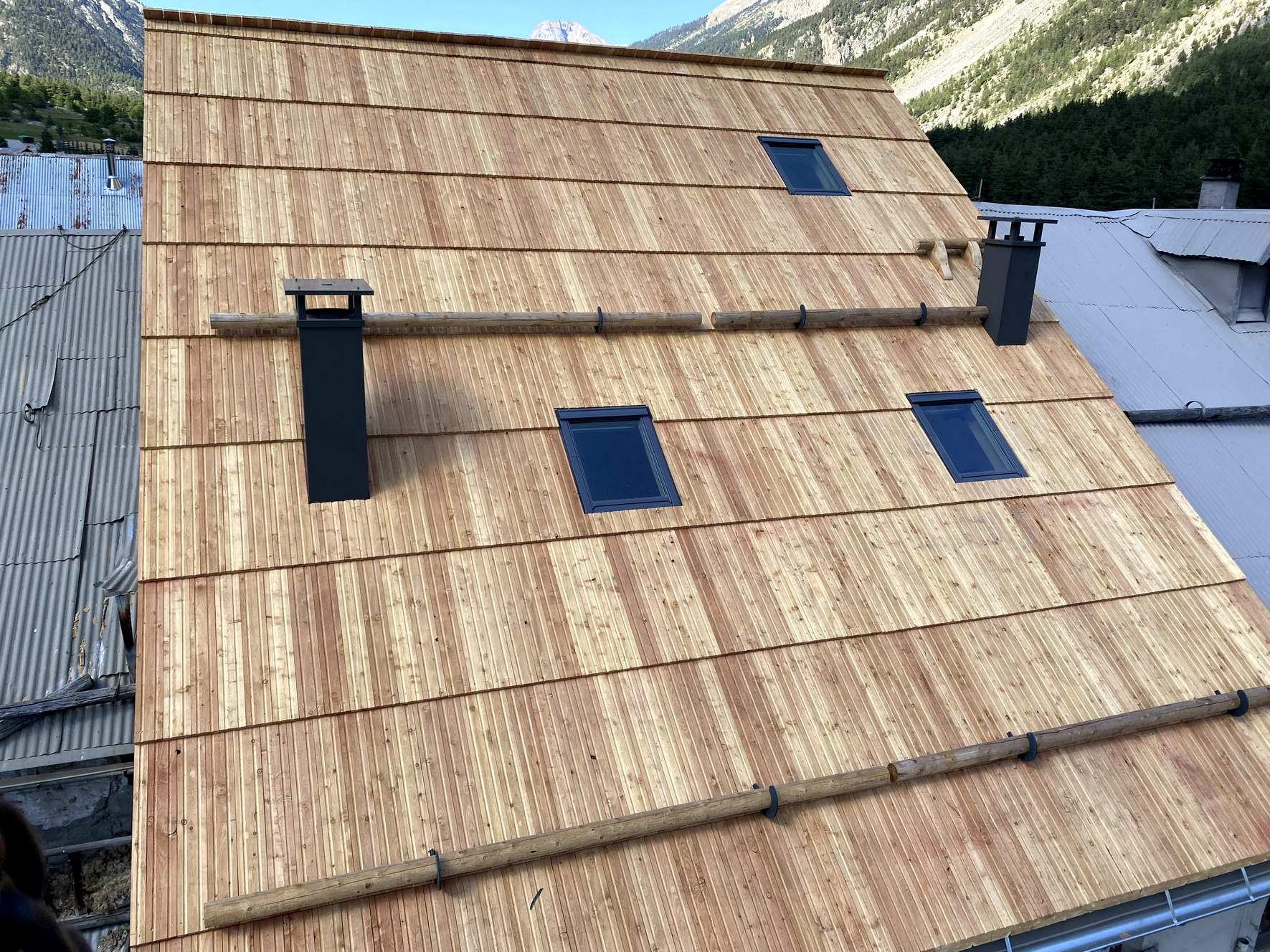 - Charpentier zingueur : couverture (bac acier et bardeaux de mélèze de pays), étanchéité, isolation toiture, murs et plancher, habillage de façades